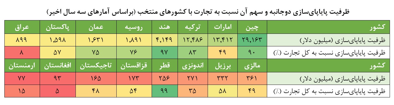مطابق با آمارهای گمرکی کشور طی سه سال گذشته، میانگین تجارت گمرکی ایران با کشورها ۱۲۰ میلیارد دلار بوده که از این میزان، سهم صادرات ۵۴ میلیارد و واردات ۶۶ میلیارد دلار بوده است. در این میان، مجموع ظرفیت پایاپایسازی دوجانبه وجوه تجاری ایران با کلیه کشورها حدود ۷۱ میلیارد دلار (معادل ۶۰ درصد پایاپایسازی) است که رقم قابل توجهی محسوب میشود و چندجانبه شدن تجارت نیز، آن را افزایش میدهد. در جدول زیر ارزش پایاپایسازی دوجانبه با ۱۶ کشور منتخب نشان داده شده است که برابر با ۶۷ میلیارد دلار از تجارت (معادل ۵۵ درصد پایاپایسازی) است.