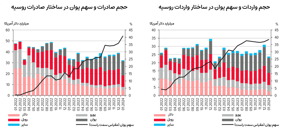 همچنین مطابق آمارهای بانک مرکزی روسیه، از سال ۲۰۲۲ و پس از تحریم‌ها علیه این کشور، استفاده از یوان در تجارت خارجی این کشور شتاب قابل توجهی گرفته و از کمتر از ۵ درصد به بیش از ۴۰ درصد افزایش یافته است[۲].