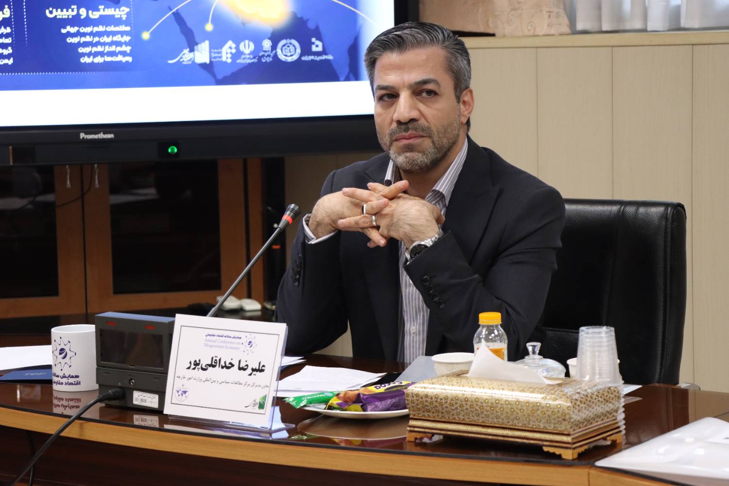 علیرضا خداقلی پور معاون مدیرکل مرکز مطالعات سیاسی و بین‌المللی وزارت امور خارجه، در نشست «ایران و تحریم در نظم نوین؛ مولفه‌های بازآفرینی قدرت» ضمن تاکید بر شروع دوره گذار از نظم حاکم بر جهان به یک نظم جدید، سه هدف اصلی تحریم‌های آمریکا علیه ایران را «امنیتی‌سازی»، «تخلیه قدرت ژئوپلیتیک» و «ایجاد بی‌ثباتی» دانست و بر ضرورت تقویت تعاملات با دیگر کشورها، استفاده از ظرفیت کریدورها و حفظ انسجام داخلی تأکید کرد. او همچنین مقابله با تحریم‌ها را امری پیچیده دانست و در این خصوص به مواردی چون استفاده از ارزهای ملی در تجارت با الگو گرفتن از روسیه، استفاده بیشتر از ظرفیت بخش خصوصی، تعریف همکاری گسترده با شرق ضمن حفظ مذاکرات حداقلی با غرب و استفاده از فرصت محدود برای فعال‌سازی کریدور شمال-جنوب پیش از پایان مناقشه روسیه با اوکراین اشاره کرد.