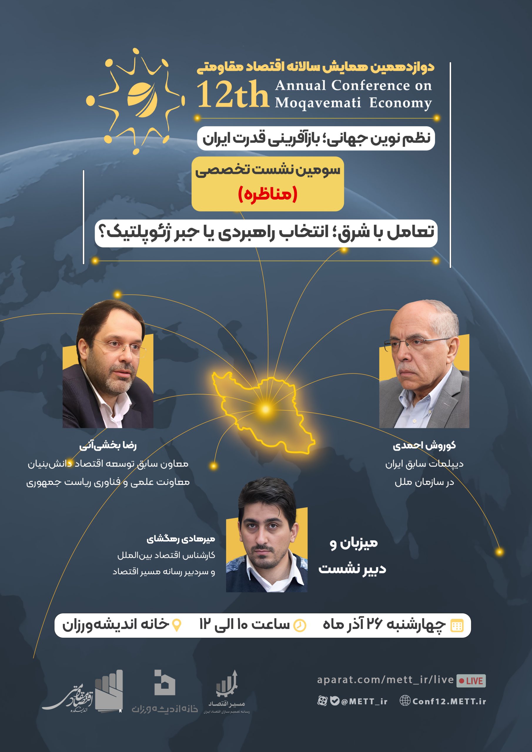 سومین نشست از دوازدهمین همایش سالانه اقتصاد مقاومتی با موضوع «تعامل با شرق؛ انتخاب راهبردی یا جبر ژئوپلتیک؟»، چهارشنبه ۲۶ آذرماه ۱۴۰۴ از ساعت ۱۰ الی ۱۲ و با میزبانی «خانه اندیشهورزان» برگزار میشود.
