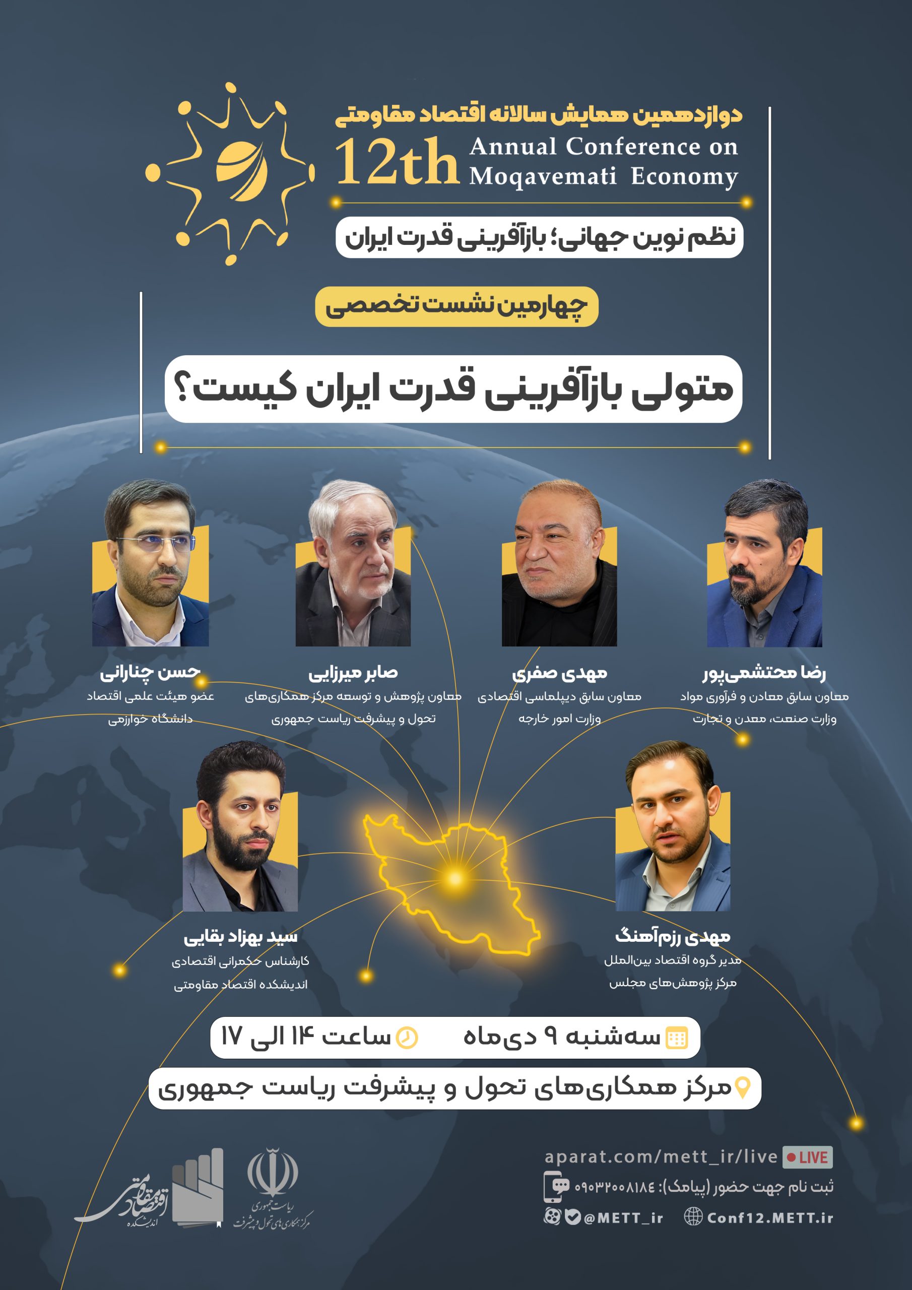 جهت شرکت در این نشست نام، نام خانوادگی و کد ملی خود را حداکثر تا ظهر روز دوشنبه ۸ دی ماه (ساعت ۱۲) به شماره ۰۹۰۳۲۰۰۸۱۸۴ به صورت پیامک ارسال و یا جهت مشاهده پخش زنده، به این پیوند مراجعه فرمایید.